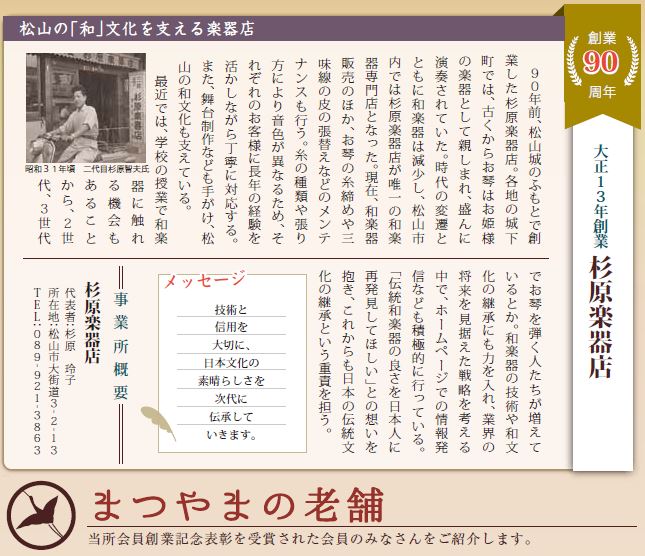 2015年、創業90周年を迎えた杉原楽器店が表彰され、松山の老舗として10月号の誌面にて紹介されました