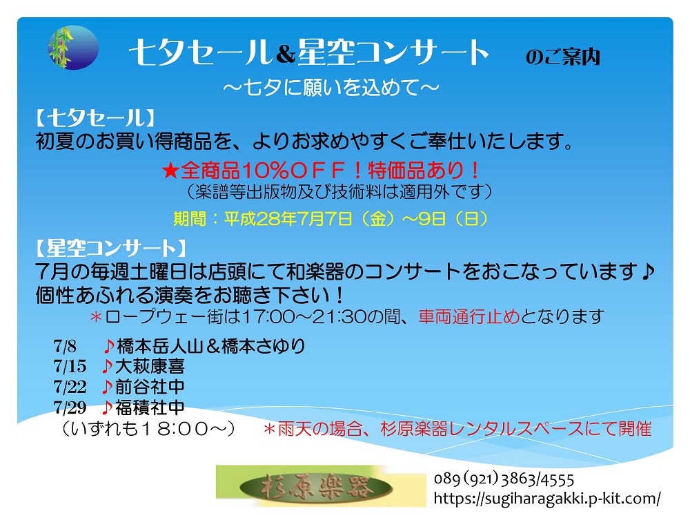 さあ今日から7月! いきなり真夏日ですねぇ(^-^; 7月と言えば「七夕セール」、今年は7日(金)~9日(日)の3日間開催いたします。 音色の良い楽器屋や特価品など数多くのお買い得品を、ぜひこの機会にお求めください(^^♪ また、8日、15日、22日、29日の各土曜日、午後6時から「星空コンサート」も店頭にて開催いたします。 今年は雨模様の場合、2Fの杉原楽器レンタルスペースに場所を移して開催です。 詳しくはお気軽にお尋ねくださいね(^◇^) ![]() |