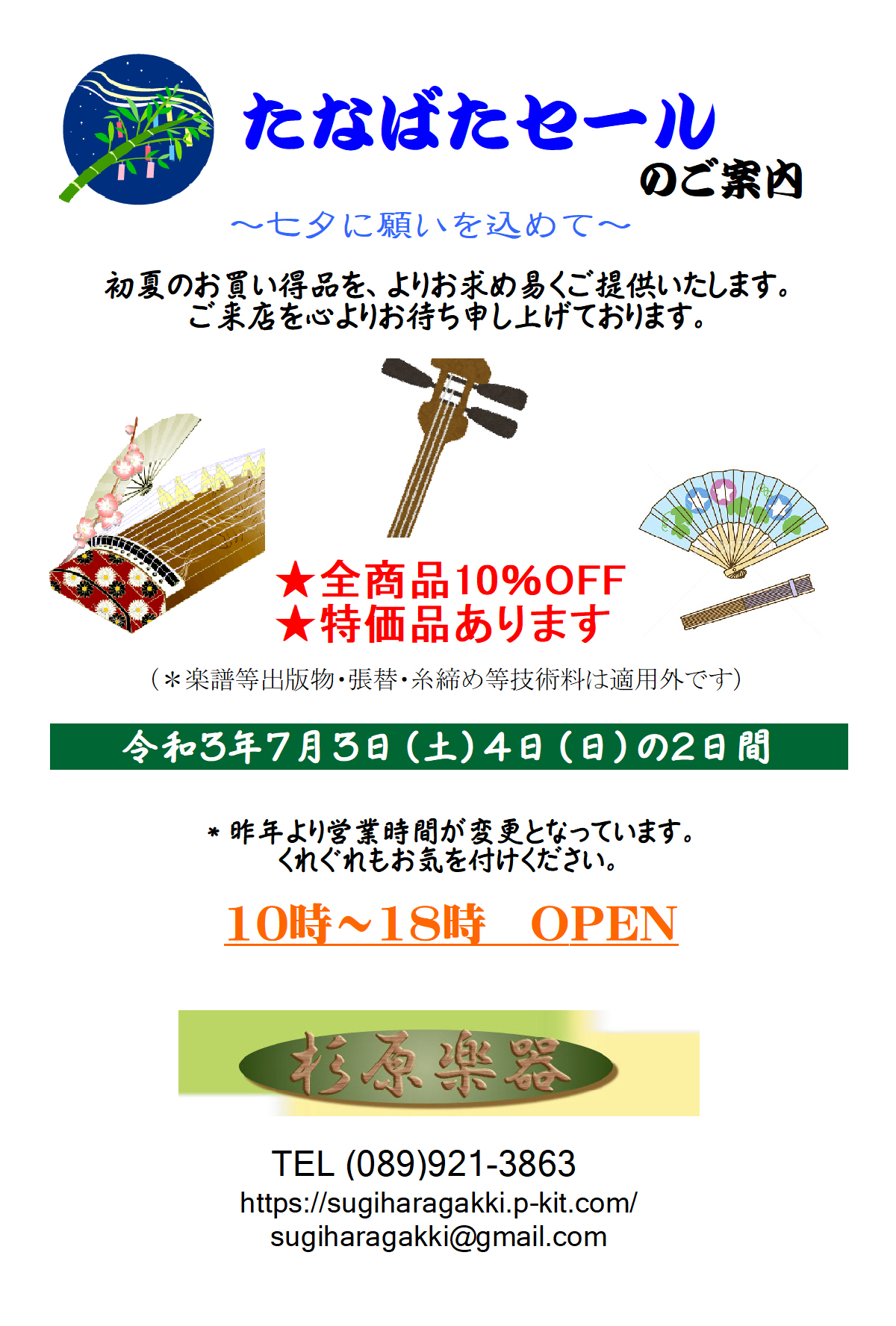 盛りだくさんの6月、その締めくくりは広島への出張でした。 予想に反して糸締めが多く、最終日にはぼろきれのようになって戻ってまいりましたw 実はその日、長女が東京から戻っている日でして、会食に参加するには頑張って仕事を時間内に終わらせる必要があったわけです。 そんなことでちょいと無理しちゃったかな~(^^;) さて昨日から7月、町内では七夕飾りを行い、風鈴の音色とともに涼しげな商店街となっております。 そして毎年の恒例と言えば『七夕セール』ですね。 今年は3日・4日の二日間です。 ご来店のお買い物は10%オフ、そのほかびっくりするような特価品や掘り出し物を準備して皆様のお越しをお待ちしております(^.^) ![]() |