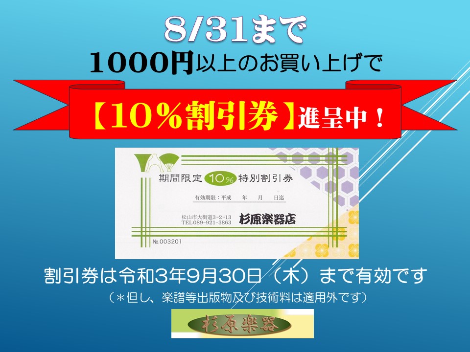 オリンピックが盛り上がりを見せる中、明日より早くも8月に突入します。 コロナ禍が再びヤバいことになっていますが、愛媛県も少し多めの感染者が出ていますね。 そんな中ではありますが、本日より松山市民会館にて3つの音楽イベントが始まります。 このうち1つは吹奏楽コンクールですが、残りの二つは邦楽イベントです。 両方に関わっていますので、今から明日一杯まで会館に缶詰となります。 そして8月と言えば『割引券進呈キャンペーン』です。 8月中に1000円以上のお買い上げで1枚、割引券を進呈します。 この券は9月いっぱいまで有効ですので、この機会にぜひ!(^.^) ![]() |