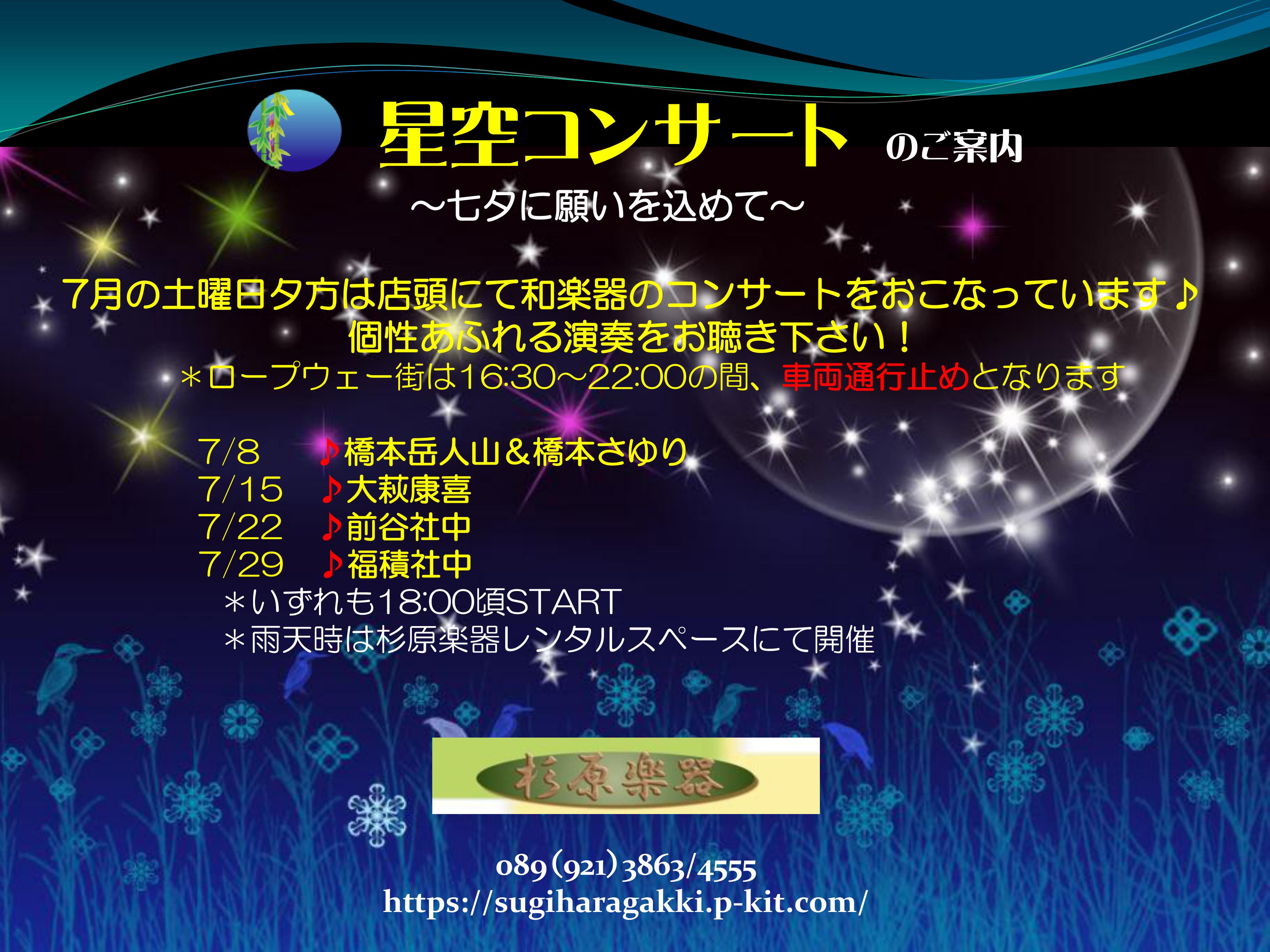 七夕セール初日の昨日、午後から雨も止んでお客様も多数のご来店でした。 中日の本日はいよいよ『星空コンサート』の第1回です。 杉原楽器店頭にて開催いたします。 まあ『星空』っていっても実際は明るいんですけどね・・・気持ちですよ気持ち(^-^; 第1回のプレイヤーは橋本岳人山さんと奥様のさゆりさんです。 ご夫婦の息ピッタリな演奏をご期待ください(^^♪ 午後6時スタート、もちろん無料です。 なお、雨天時は杉原楽器2Fのレンタルスペースで行います。 ![]() |
