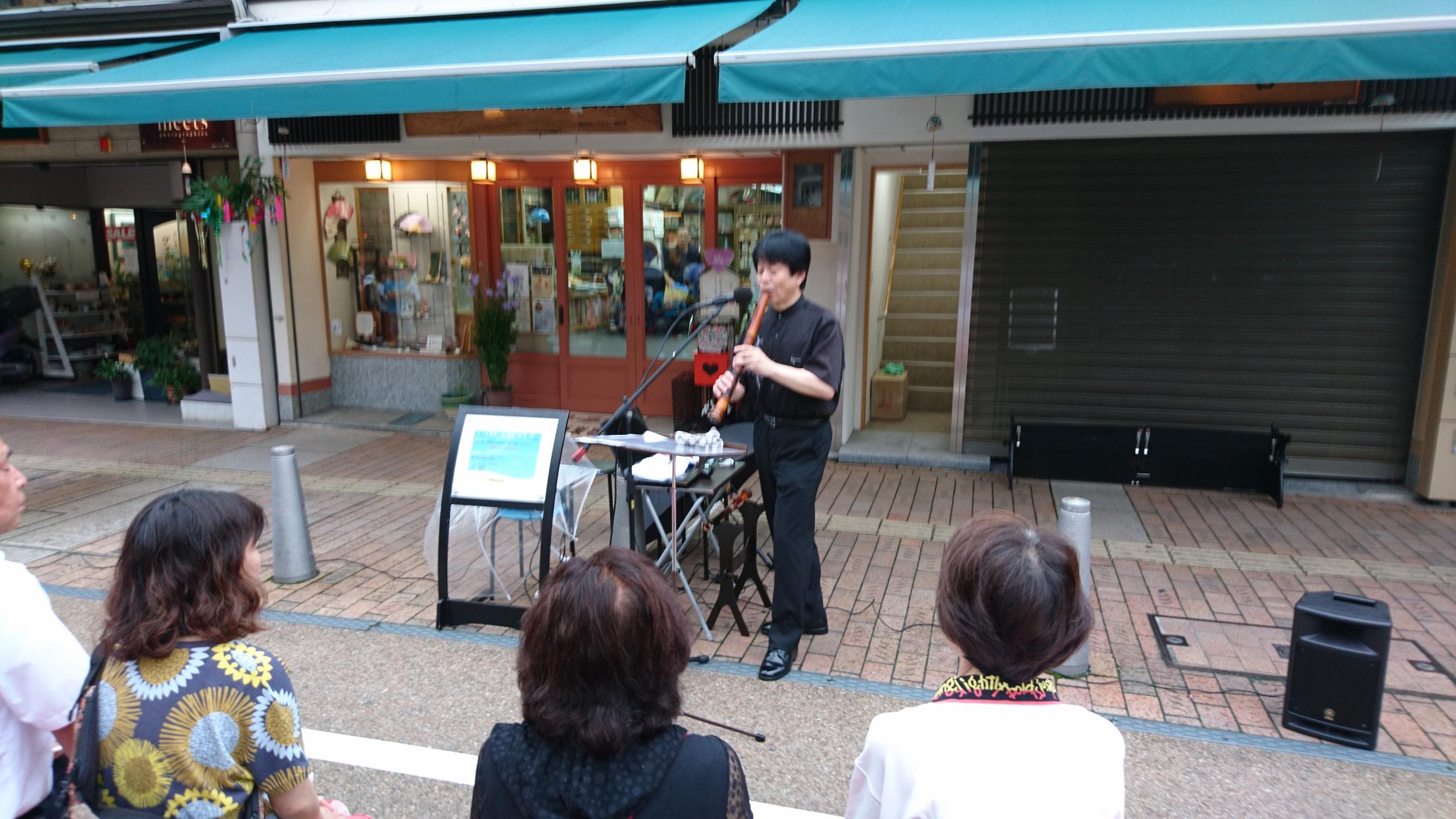 昨日の星空コンサート1回目、たくさんのお客様が足を止めて聞いてくださり、本当にいいスタートが切れました。前半は筝と尺八、後半は尺八のショーという構成でしたが、さすがの橋本先生ご夫妻でしたね♪ 奥様のさゆりさんも非常に難しい曲をさらりと披露、岳人山さんも持ち前のエンターティナーぶりをいかんなく発揮されました。 途中雨が降り始め、楽器やら機材やらが濡れ始めたのには焦りましたが、どうやら通り雨だったようで(^-^; ![]() さあ今日はセール最終日、頑張ってまいります(^-^) |