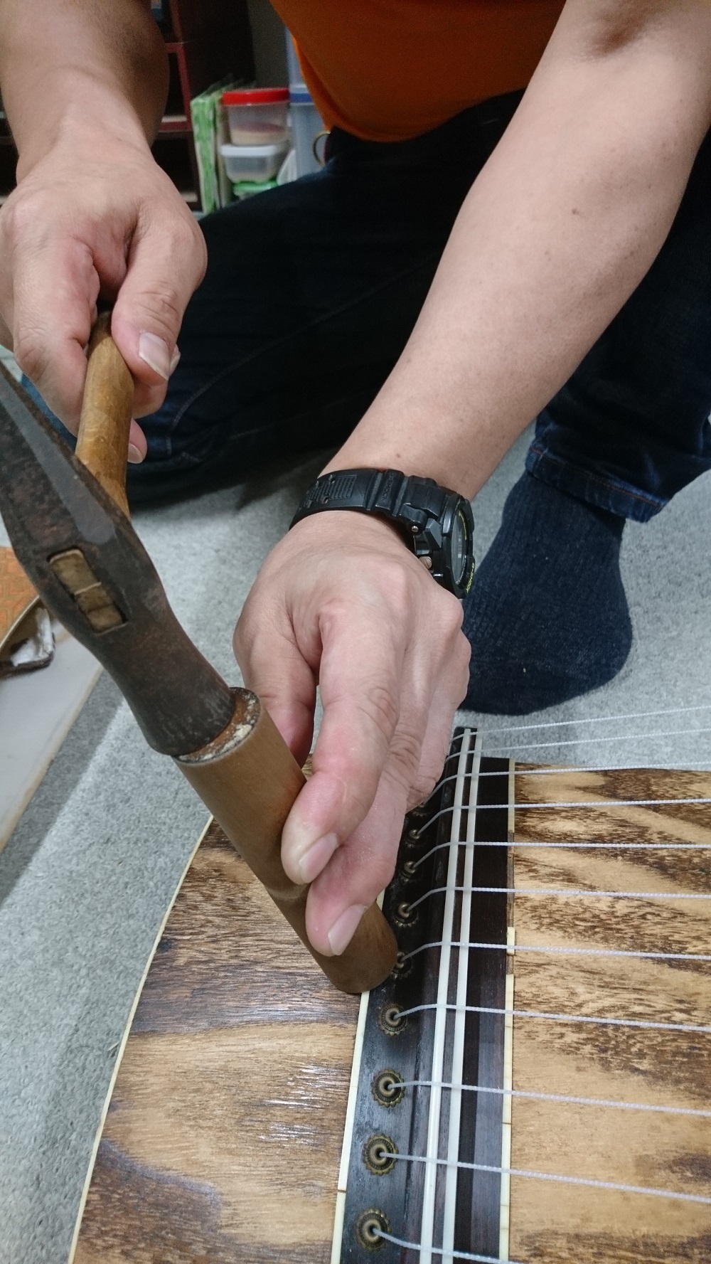 今日とあるお客様からメールがありました。 内容は『六と七の糸の止めてある金の部分が、浮き上がっているのですが、修理が必要でしょうか。』っていうもの。 四部六部分にある糸芯金具を通す穴は、結構なストレスにさらされているものです。 たとえ紅木製であってもいつかは摩耗により穴が広がってしまいます。 さらに糸締めによって強いテンションを受け続けていますのでなおさらです。 これが原因で金具が四部六から浮き上がることはよくあることです。 でも演奏には全く支障はございません。 「う~ん、でも見た目が気になるなぁ」って人は、ご自分で簡単に対処できます。 ![]() このように糸に触らぬよう添え木をし、ハンマーなどで軽くたたいてやると大抵は元に戻ります。 当たり前だけど叩きすぎると四部六を痛めますよ(^-^; あ、自信のない方はお店にお持ちくださいw さて今日からお祭りの御幣がロープウェー街に飾られました。 秋祭りを控え、ますます秋の気配ですね(^-^)