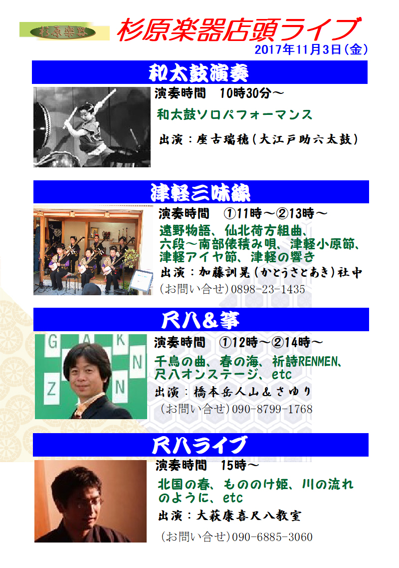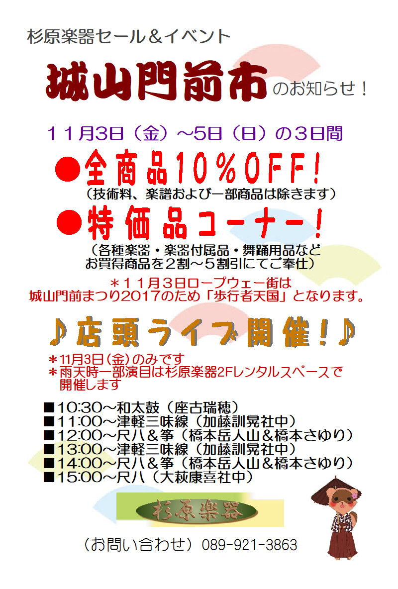 台風一過、ついに一気に寒くなりました。 明日から服装を考えないと風邪ひきそうです(^-^; さて今年もロープウェー街では11月3日に「第19回城山門前まつり」が開催されます。 1日歩行者天国となり、ロープウェー街全域でイベントがあったり出店が多数出店します。 杉原楽器でも3日~5日の三日間、セールを開催いたします。 商品が10%OFFで、2~5割引きといった特価品も多数ございます。 また3日のみですが、店頭では和楽器ライブを開催いたします。 今年は和太鼓に始まり津軽三味線や尺八、筝のライブを開催♪ これはもうロープウェー街に行かないと損しますね~(^◇^) ![]() ![]() |