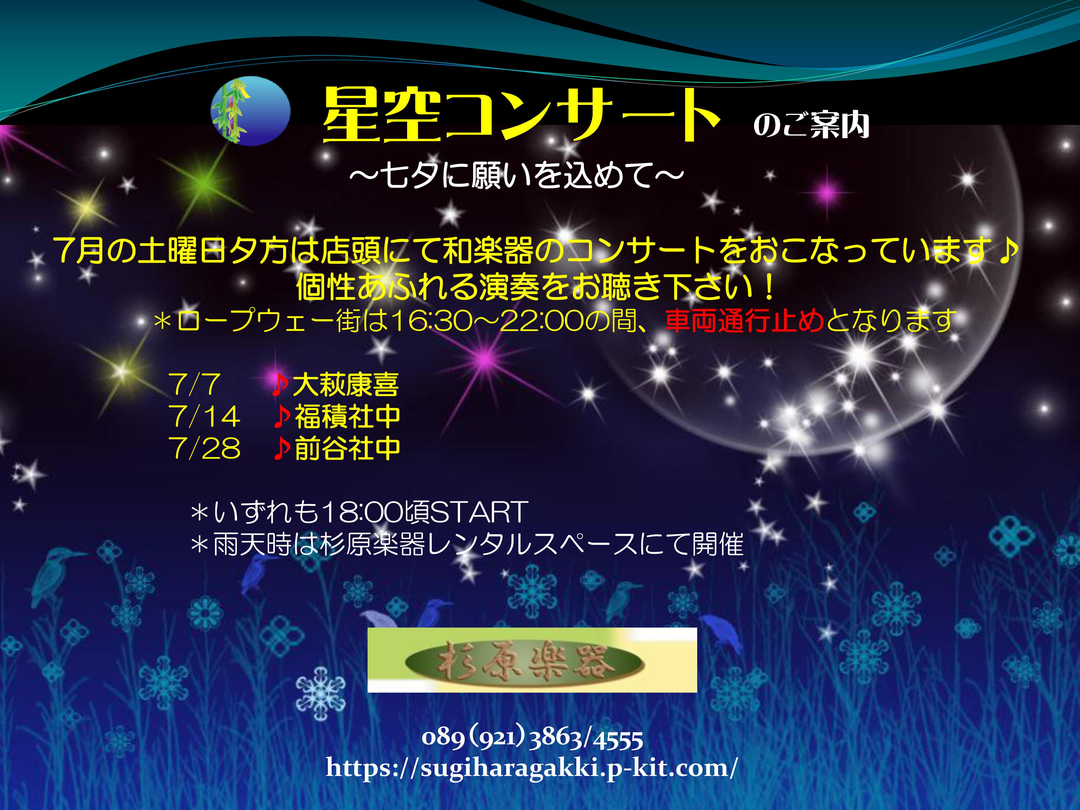 予告です。 毎年7月の土曜日夕方は「土曜夜市」と称しまして、ロープウェー街の南側半分がホコ天となります。 そこでいろいろ出店やイベントがあるのですが、杉原楽器店頭では恒例の「星空コンサート」を開催しております。 18時から小一時間程度で「星空~」と銘打ちながら毎年明るいんですけどw 今年は7日、14日、28日の3回開催です。 21日は演奏会の都合で僕らは出払っておりますので音響等はありませんが、とあるお社中が生音で演奏予定だそうです。 もちろん21日もホコ天ですので風鈴の音色に包まれながらロープウェー街をぶらり歩いてみてはいかがでしょうか(^^) ![]() |