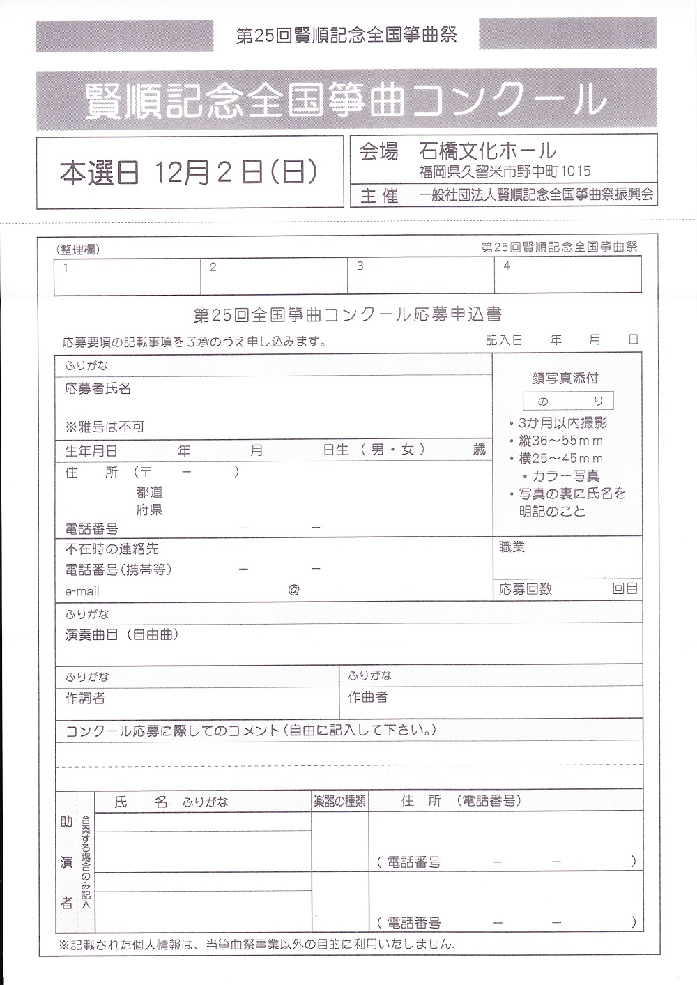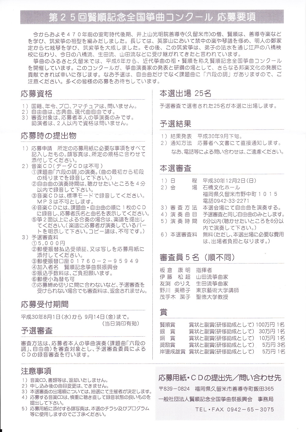 邦楽界には様々なコンクールがありますが、先月の「くまもと全国邦楽コンクール(旧長谷検校コンクール)」と並び、ある種演奏家のステータスをかけたもう一つのコンクールが「賢順全国筝曲コンクール」です。 今年で25回目という。 こちらは賢順賞(最優秀賞)賞金が100万円で、この種のコンクールでは最も高額です。 そんなコンクールの募集が8月1日から始まります。 先月のくまもと全国邦楽コンクールでは松山から初の最優秀賞受賞者が出ました。 この勢いで皆様も応募されませんか? 募集要項と申込用紙を掲載しておきます。 それぞれの画像をクリックするとPDFのダウンロードができますので印刷してご使用ください(^^) |