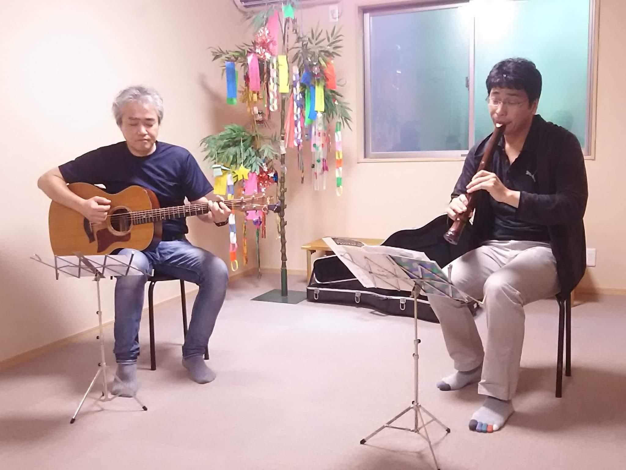 二日前の話ですが、その土曜日は恒例「星空コンサート」の第1回目でした。 ただ記録的な大雨が予想されたため、3日前にまず門前土曜夜市の中止を決定、それに伴い通常通り車両運行可能なため、コンサートもレンタルスペースを使って行うよう演者の大萩さんにお願いいたしました。 ただ本当に状況がひどくなり、様々な交通機関、道路などがSTOP。 当日土曜日の早朝、大萩さんから「門下生が全員来られなくなりましたので、私の単独コンサートっていうことにします」と連絡が入りました。 おおそれは残念だけどなんせこの状況なら仕方あるまい・・・と。 で、お店に出てからまたまた連絡があり、「あの~一緒に演奏しませんか?」 おお~そう来たかw なんせもう何か月もギターに触ってないし、絃もそのまんま、いいのか? 結局去年坂の上の雲ミュージアムで演奏した3曲をチョイス。 楽譜はもともとなかったんですが、その時に書いた暗号のようなコード譜をスタジオで発見。 案の定8割がた忘れてましたが何度か弾いてるうちにだんだん思いだし(^_^;) そんな感じで臨んだ本番、人通りも少なく災害による暗いイメージが蔓延する中、ありがたいことに数名のお客様が駆けつけてくれました。 もともと大萩さんいわく「一人でもお客さんいるならやります」っていうスタンスでした。 けどね、思ったんですが少ないとそれはそれで不思議と緊張するもんですね(^_^;) まあ部屋ん中ですから近いしw 不思議な感覚のままコンサートも何とか無事に終えました。 ご来場のお客様、本当にありがとうございました(^^) ![]() |