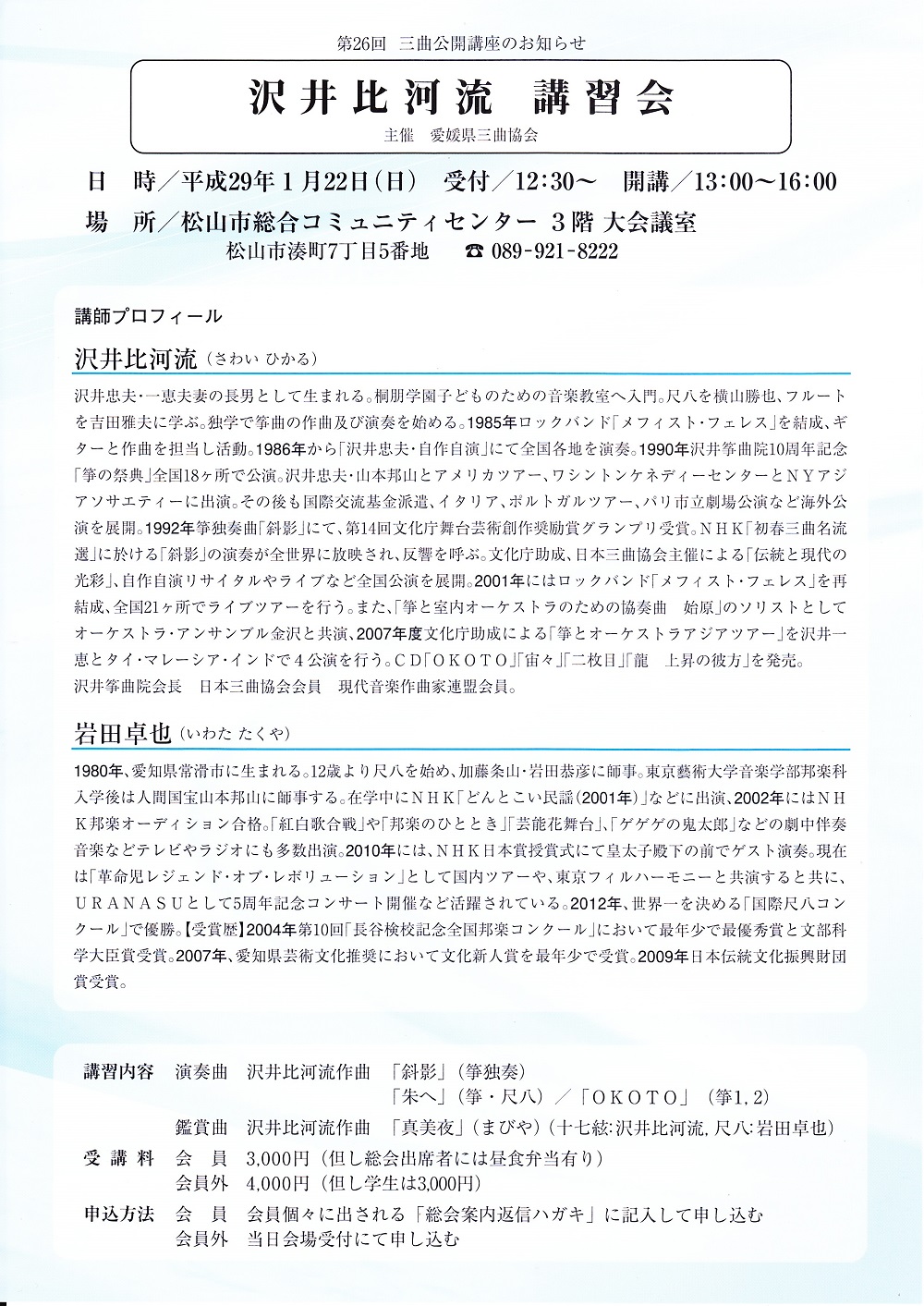 明日は愛媛県三曲協会の総会と講習会があります。 で、本日午後からそのためのリハ&打ち合わせに出かけてきます。 今回の講師は沢井比珂流さんと岩田卓也さん。 比河流さんは平成12年に僕の企画した講習会で来ていただいて、それ以来演奏会やら飲み会やらでご一緒してます。 あるときは沢井箏曲院創立25周年記念イベントで、和楽器の講習会の講師をさせていただいたりもしました。 また、プロのギタリストという1面も持っていて、何かとギターや洋楽の話題で毎回盛り上がるのですw 尺八の岩田さんは彼が芸大時代、松山のとある先生のリサイタルで第2尺八で起用されたのが最初の出会い・・・もうこれも10数年以上前かな? それからいろんなコンサートで一緒になり、会うたびに成長してるって実感がすごくありました。 数年前には尺八の国際コンクールでチャンピオンになるなど、すっかり脂が乗っている演奏家です。 彼もお酒が大好きで、2次会と称しホテルの僕の部屋で熱く語りあかしたこともw 今宵は食事会も予定されており、講師と僕の男組は同じテーブルとのこと・・・楽しみですw 明日の講習会は三曲協会主催ですが、もちろん会員以外も受講OKです。 詳しくはこちらで♪ ![]() |