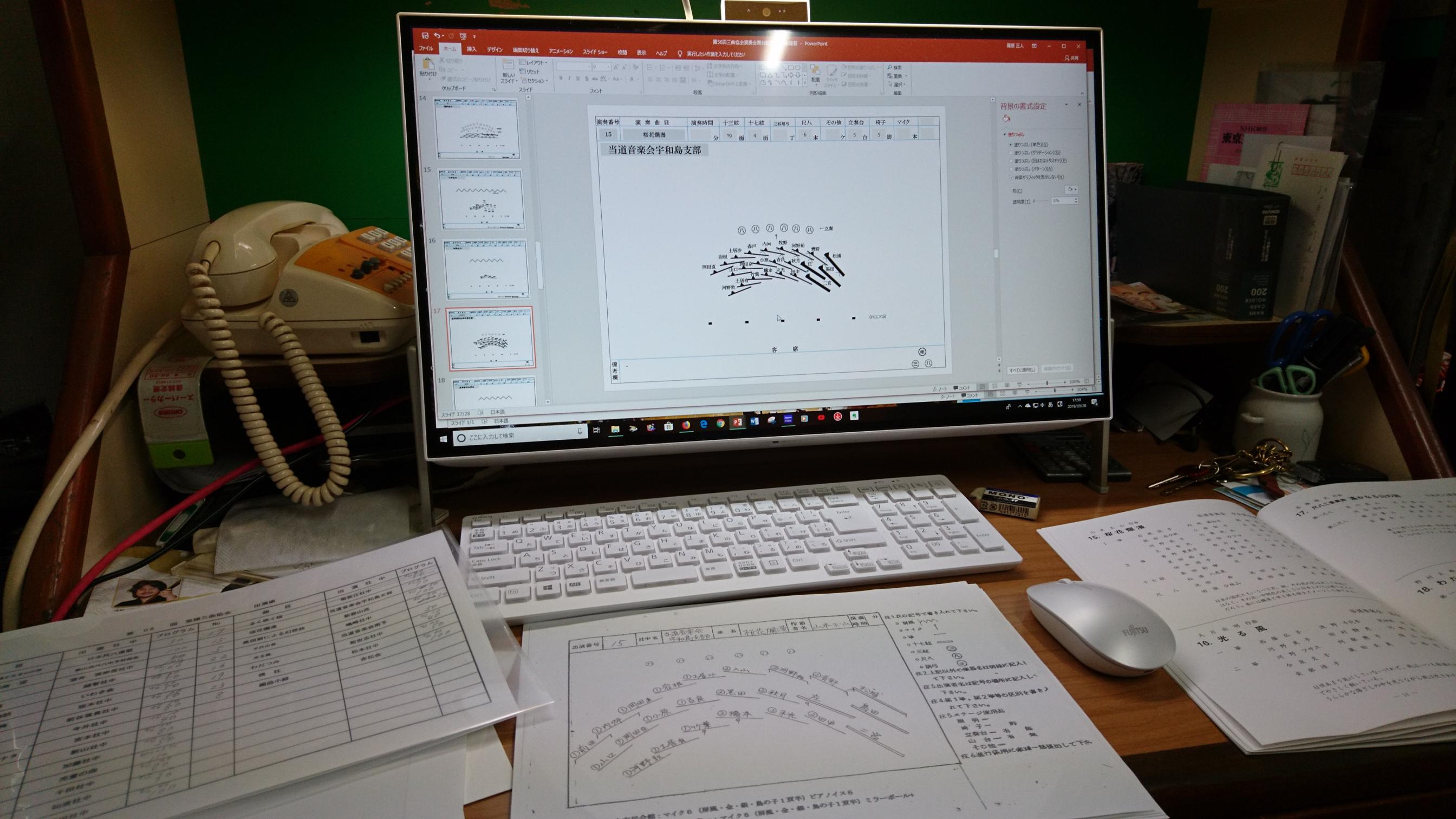 火曜日は近年定期的に飲み会をしてる同級生の集いでした。 この中の1人が4月から職場を異動になったので、ささやかだけどそのお祝いも兼ねてね。 まずは豚珍行で美味しいラーメンと餃子、そしてニラ玉をビールで流し込んだ後、ワインを4.5リットル準備しスタジオにて飲み方開始w 映画観たり音楽聞いたり楽しいひと時を過ごしてたんだけど、僕以外のメンバーは翌日早起きしなきゃいけないってことで、わりと早めにお開きにしました。 といってもテッペンはは軽くクリアしてたんだけどねw 久しぶりに僕もストレス解消・・・っていうかお前にそんなものあったのか?と各方面から突っ込み殺到覚悟ですけど(^_^;) で、翌日みなさん無事に仕事してたようです。 さて今日は4月下旬に開催される三曲協会演奏会の舞台打ち合わせを行ってきました。 もうすでに配置図から楽屋割から資料は作成してて、実際の舞台担当のスタッフとの図面上のすり合わせが目的です。 もちろん最終チェックは前日と当日午前中の現場リハーサル。 ここですべて変わることもままあります。 いずれにせよあらゆる可能性を予測しておくことが大事ですね(^^) ![]() |